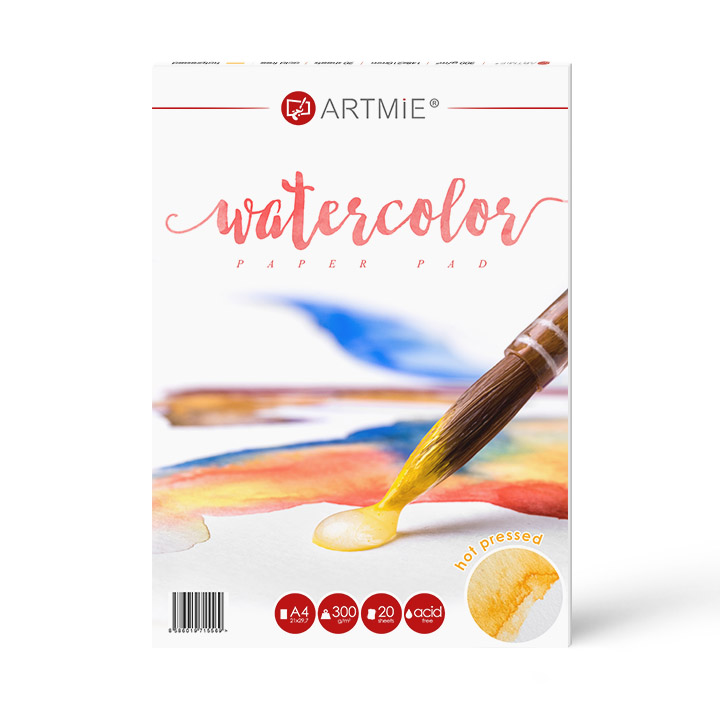 Ексклузивният блок за акварел ARTMIE hot press е традиционно направен от 100% целулоза и е идеален за рисуване с акварелни бои, за гваш техника (gouchache) или туш. Влакната са равномерно разпределени, което прави акварелната хартия по-стабилна и не позволява да се деформира. Запазва висок блясък, естествена прозрачност и наситеност на боите, а същевременно добре абсорбира вода. Блокът хартия ARTMIE е направен 100% без киселина, устойчив е на времето и е здраво залепен. В блока има 20 листа в натурнално бял цвят с грамаж 300 гр/м2. Достъпна е в размери A5, A4 и A3.