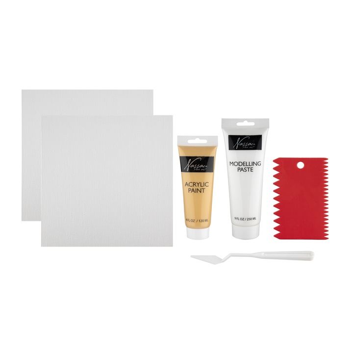 Sada na modelovanie Nassau съдържа всичко необходимо на tvorbu trojrozmerných umeleckých diel. Je navrhnutá pre umelcov všetkých úrovní, od začiatočníkov po profesionálov, ktorí искат experimentovať s rôznymi technikami a materiálmi.Sada съдържа maliarske plátna v rozmere 25x25 cm, modelovaciu pastu s objemom 250 ml, která je ideálna na vytváranie textúr a reliéfov na rôznych повърхностoch a súčasťou sady je aj zlatá akrylová farba, která dodá vašim dielam luxusný a žiarivý vzhľad.Pre precíznu prácu sú v sete zahrnuté aj špachtľa a stierka, ktoré позволяват detailné tvarovanie a nanášanie pasty či farby. Táto modelsacia súprava je ideálna pre všetkých, ktorí chcieli rozšíriť svoje umelecké zručnosti a objaviť nové techniky.